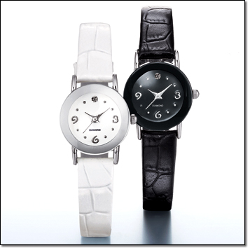 | Genuine diamond accent on dial at "12." 9" L leather strap. White Also available: Black |